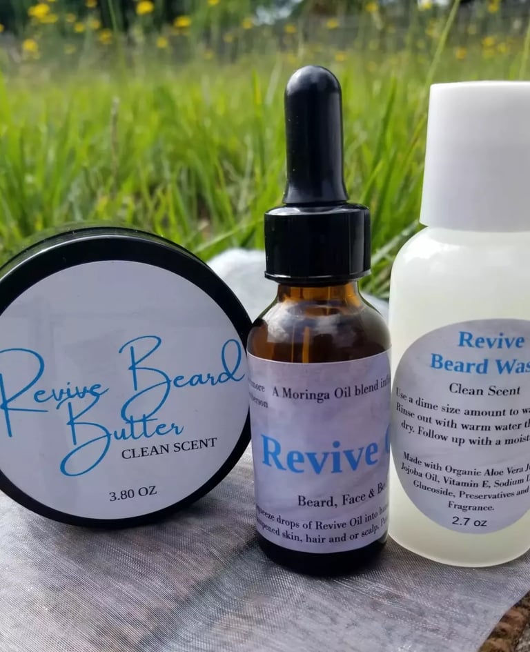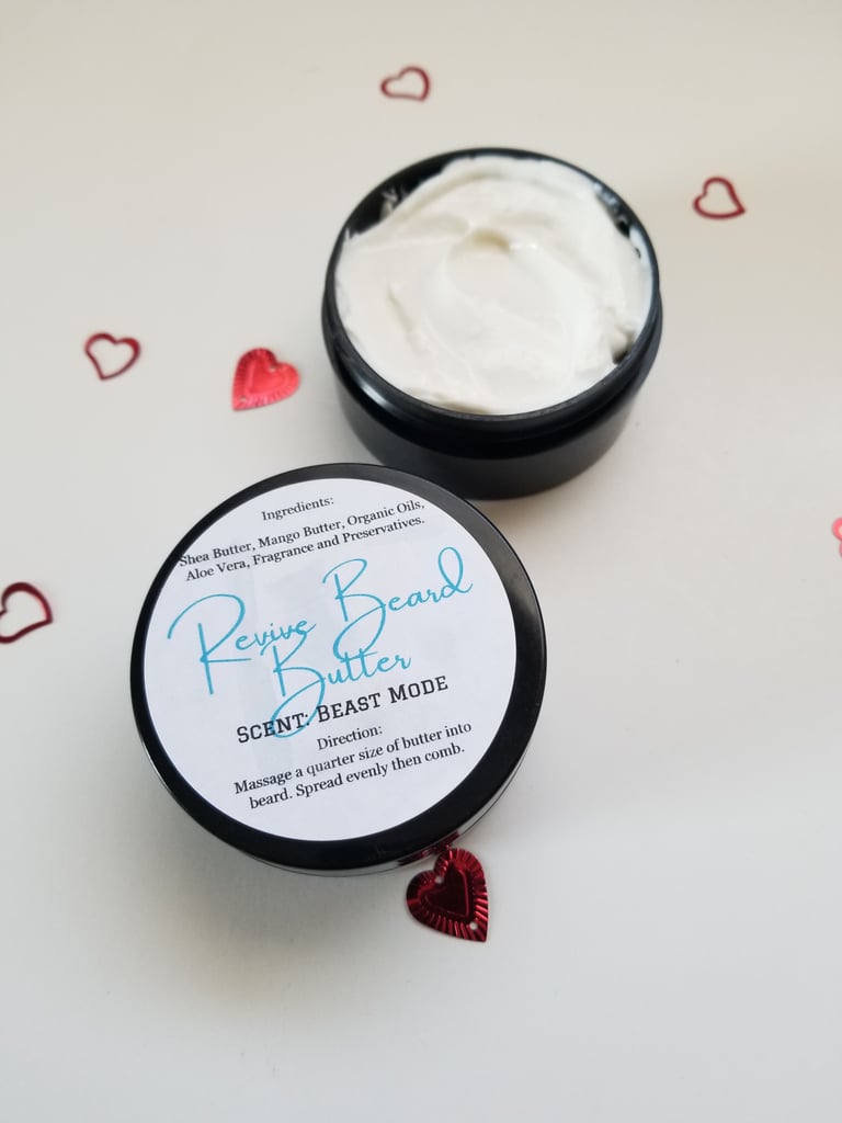 **It is recommend to do a patch test before use. The REVIVE Beard Butter made to add moisture and softness to your beard. You can see reviews on my social medias and website. Jar will vary. It comes in 3 scents; A Sandalwood Blend, Clean Scent And Beast Mode a Cedarwood blend. All blends are unique each time it is made meaning the scent may be slightly different each time you purchase depending on the oils I have available, but i usually TRY to keep blend the same.
